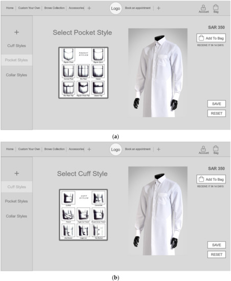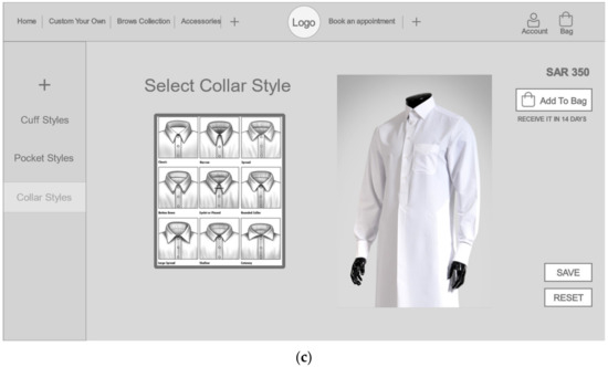 Custom design interface; (a) pocket style; (b) cuff style; (c) collar style.
