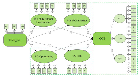 In this study, items that did not meet the standard were removed through factor analysis, and 8 factors composed of 37 indicators were obtained in the end. The total variance explained by each variable was higher than 60%, and the difference between different dimensions under the same variable was obvious. The reliability and validity test results are shown in Table 3. Cronbach’s Alpha values of various variables, such as government-led green publicity, perceived green opportunity, perceived green risk, perceived green intention of territorial government, perceived green intention of the competitor, corporate green behavior, and government environmental regulation, are all higher than the criterion of 0.7, indicating a good reliability level of this measurement.