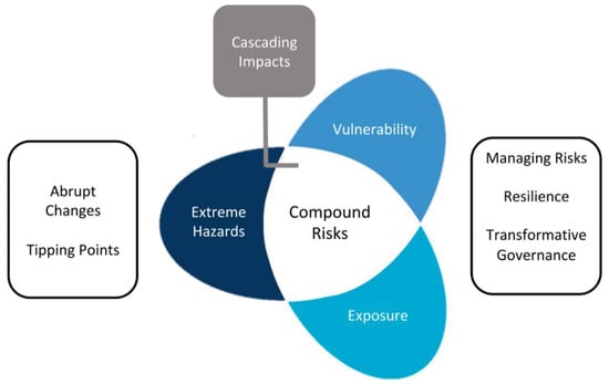 Extreme events, including wildfires, are the result of various environmental pre-conditions. When multiple events are combined, risks are compounding. Compound risks are defined by environments that are failing at multiple levels thus ”amplify [the] overall risk and cause cascading impacts” (Section 6.8.1 of []), see Figure 1. Human influence has likely increased the chance of compound and extreme events since the 1950s []. The IPCC states that for Australia, “there is medium confidence [that the] increase in fire weather conditions [is] due to human influence [].”