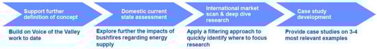 This section summarises the research steps applied to explore DES adoption and opportunities at the domestic level. First, the study sought to develop a better understanding of the Emergency DES concept through a stakeholder workshop and expert interviews. The DES concept had been put forward as part of the Gippsland’s Smart Specialisation Strategy, a project led by the Latrobe Valley Authority (LVA) and has been further developed by the Gippsland community group Voices of the Valley as a response to the 2019/2020 Black Summer fires (introduced in Section 1.3). Second, we assessed the impacts of the recent wildfire events on energy supply and energy infrastructure in Australia through desktop research and semi-structured interviews.