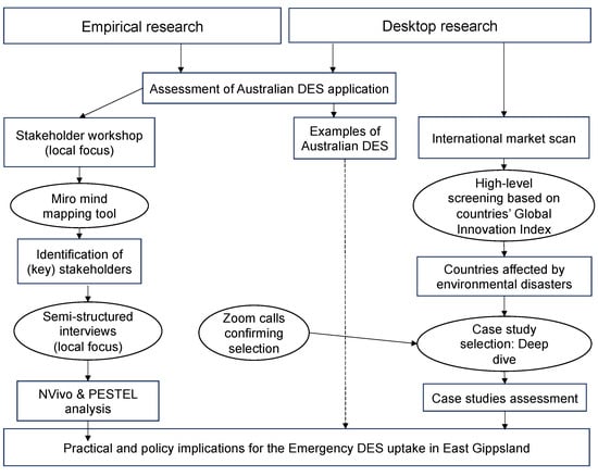 In this study, we applied a mixed-methods approach combining empirical and desktop research. The empirical part included a domestic stakeholder forum, and semi-structured interviews which were conducted between July and September 2020 in Victoria, Australia. The desktop study involved the assessment of DES adoption at the domestic (Australian) and international level as a response to climate emergencies and as part of disaster prevention strategies.