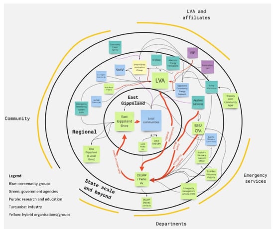 All three dimensions of governance—local, regional, state and beyond—will contribute to the development of a resilient energy system piloting in East Gippsland (Figure 6). The map shows the diverse stakeholders and how they are connected. The connections associated with the Smart Grid Innovation Group (Figure 6, yellow post-it) demonstrate the relevance of hybrid groups to increase interconnectedness among stakeholders. The red arrows in Figure 6 indicate connections between organisations that have been identified as core players and may influence and/or be affected by a “resilient and reliable energy system”. The critical path to implementation is highlighted in orange, and involves government departments, emergency services, communities, the LVA and associates.