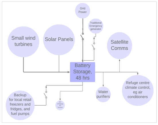 Maintaining a critical perspective towards technical and economic developments is crucial. The literature shows that it is important to maintain a critical perspective towards technical and economic developments that emerge in the aftermath of climate emergencies. We use the term ‘extreme event’ or ‘climate emergency’ and therefore avoid the term ‘natural disaster’ (where possible) to stress that climate change is a major driver behind many of the events discussed in this article [,]. The terminology around external drivers has advanced since the 2000s, where terms were less specific, for example, Luft (2009) used the term “na-tech” to describe the partly natural, partly human-made disasters []. The literature discussing Hurricane Katrina was particularly critical of government-led responses. Dawson (2010) refers to legislative changes which had been advertised as solutions but were “seek[ing] to profit from the…crisis” as ‘green capitalism’ []. In the case of the 2019/2020 Australian Black Summer fires, a “green recovery” for wildfire-affected communities is anticipated including the roll-out of sustainable fire-proof homes and grid modernisation []. Adopting Emergency DES supports grid reliability as the electricity supply is based on renewable energy and can operate independently of the main grid. There are also economic objectives including lower cost electricity and it is predicted to stimulate clean energy employment in regional economies [].