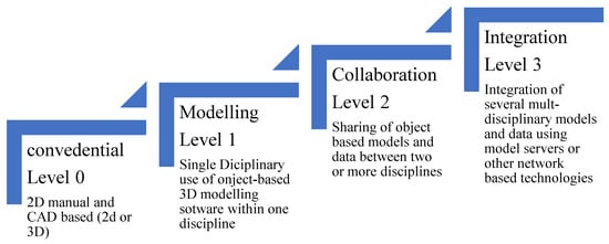 According to Succar [21], there were four BIM levels: conventional, modelling, collaboration, and integration, as shown in Figure 2. Each level reflects various process stages, resources, techniques, levels of knowledge, and cooperation needs [22]. This also provides evidence that each level identifies different deliverables required from different users for different benefits and purposes.