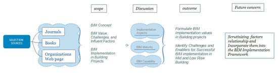 BIM is a comprehensive technology process that extends its approach through all construction domains, among different stakeholders throughout the building project life cycle [1,2]. It’s continues powerful benefits for enhancing productivity and efficiency have contributed to a sustainable construction environment [3]. BIM plays a massive role in influencing decision-makers in the construction industry, encouraging them to promote and enforce its implementation in the various construction contexts [4,5,6]. Since the 1970s, transformation from traditional construction practices to BIM-based design has become one of the most widely debated and written about topics in construction research [7,8]. As the BIM process is a sophisticated process that requires wider awareness and collaboration among construction players, extensive effort is needed to overcome the challenge of transformation from traditional to BIM-based process [9,10]. Additionally, BIM implementation requires knowledge of the available tools, techniques, level of information, and collaboration that determine organizational readiness and maturity to implement BIM [11,12].