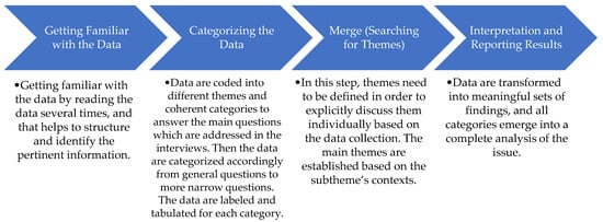 - Personal interview—face to face and online session—with 9 Experts that used thematic analysis method for analyzing the qualitative data [35,36]. The process of the thematic analysis had been critically reviewed and summarized in four main steps as describes in Figure 4.