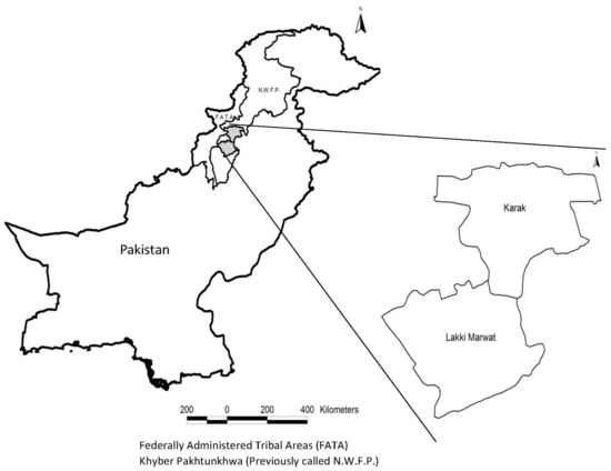 The primary data were collected through a structured questionnaire survey and were pretested in the study area. The data collection was undertaken from September to December 2017. The sample size was 395 farmers. A multistage random sampling method was adopted for the sample selection. In the first stage, the Karak and Lakki Marwat Districts were purposefully selected. Second, four Union Councils from each district, and two villages from each Union Council were selected. In the final stage, a list of farmers was prepared from the villages, and 395 respondents were randomly selected using Yamane’s formula [16].