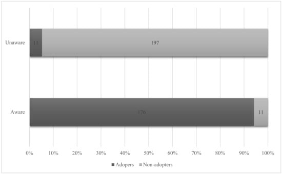 First, all of the variables used in the regression model were tested for multicollinearity. The variance inflation factors (VIF) showed no multicollinearity in the model. After testing for multicollinearity, the goodness-of-fit for the regression model was tested: the χ2-value for the awareness model was 24.715, with a p-value > 0.05, and the χ2 value for the adoption model was 40.131, with a p-value > 0.05. Thus, the models were a good fit.