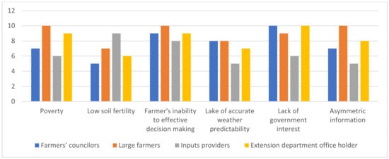 The key informants specified many problems, such as poverty, low soil fertility, the farmers’ inability to make effective decisions, the lack of accurate weather predictability, the lack of government interest and funds allocation for extension services, and the asymmetric information in input markets.