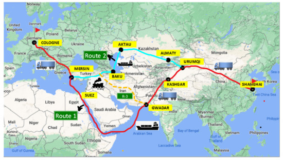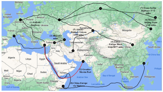 Massive investments in infrastructure are made by the world’s biggest economies to facilitate logistics, supply chains, and mobility. During the COVID-19 pandemic, global markets had to face massive disruptions in supply chain networks, and lockdowns across borders enforced the exploration of alternative routes. The world trade volume grew by 3.6%, while container traffic (measured in TEUs) increased by 4.8% in 2017–2018, which was double the rate in the previous year in 2016 [4]. According to EUROSTAT 2017 [5], Germany spends EUR 17 billion while Turkey spends EUR 4 billion on inland freight transportation. As the trade volume increases, the problem of congestion starts to increase as well. According to European statistics, more than three-quarters of the total inland freight transportation is being carried by road, making safety and the environment major concerns [6]. The major port of Europe in Rotterdam currently carries 55% of the freight via trucks for inland transportation [7], and it is aimed to reduce this percentage to 35% by 2030 and to reduce carbon emissions by more than 50% by 2050 [8]. Apart from environmental issues, burdening a single mode of transportation with freight where the same route is also being used for public transportation poses serious risks of congestion in peak hours, such as for ambulances. For a sustainable supply chain network defined by robustness and flexibility, a detailed network analysis for alternatives needs to be discussed. Moreover, the load needs to be distributed among other modes of transportation, such as rail and sea. The current study explores a case study of the OBOR initiative in a wider network that is spread across continents. The case study discusses all significant transshipment nodes in the network that have not been discussed so far in the literature. The purpose is to explore all possible routes and linkages, including train, road, and port networks.