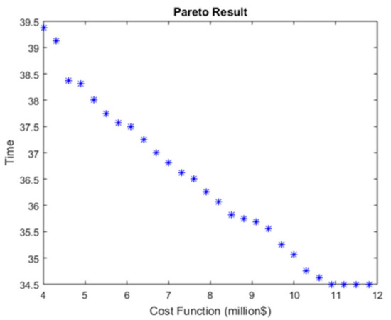 We ran tests to obtain Pareto solutions for the time–cost trade-off problem. The ε-constraint method [46] was used to obtain the solutions for the linear and non-linear cases. Figure 3 represents the Pareto extreme solution obtained for the linear case. In previous cases of intermodal transportation [35], the error was found to be less than 5%; hence, our approach uses the linear case to obtain these non-dominated solutions. The existing case study is spread across a larger network. The main focus was the OBOR corridor and the transfer link from China to Europe. In particular, Germany was selected as the final destination, since it shares the largest import costs with China [47]. In order to explain this, we explain some of the solutions obtained in the non-dominated Pareto front.