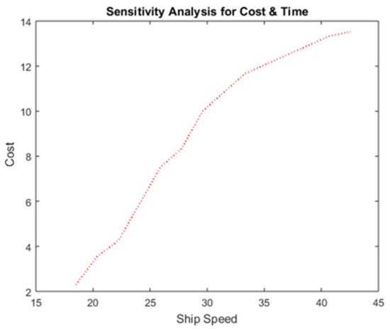 Container ships are considered the most economical way of delivering goods. The fuel costs of a ship constitute the most significant cost of voyages [40]. The fuel consumption of a ship depends on various factors, such as the type of fuel, engine type, ship size, etc. However, vehicle speed plays the most important role in determining the fuel consumption of a ship [41]. The speed is generally measured in knots (1 knot = 1.8 km/h) and ranges from 10 to 25 knots. Container ships, on average, travel at a slow steaming speed range of 15–20 knots, while minimal cost can be obtained in the speed range of 10–12 knots. However, even a slight change in the ship’s speed can affect fuel consumption. For example, changing ship speed from 24 to 21 knots can reduce fuel consumption to 33% [42]. Researchers have made various efforts to predict the optimal speed of a container ship by taking various factors, such as ship size and engine power, into account [43]. In another study [44], it was observed that static analysis is not sufficient to determine the optimal ship speed, and a dynamic analysis that also accounts for weather changes along the route should be performed. However, none of the studies discussed the relation of a vessel’s speed with fuel consumption in intermodal transportation models. Classical formulas used to calculate the fuel consumption of the ships did not consider the weight of the ship. For the present case, a modified form of classical formula was used, which considered the effects of dynamic weather changes and the weight of the ship [45]. The fuel consumption was calculated against an input vessel speed and was multiplied by the total travel time to obtain the total fuel consumption. For the calculation of the cost, cost parameters were obtained from a UAPS report in the form of unit cost for fuel, maintenance, and other considerations. In the next section, the results of the experiments performed will be discussed in detail.
