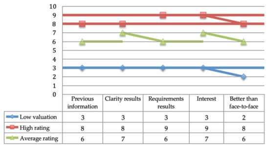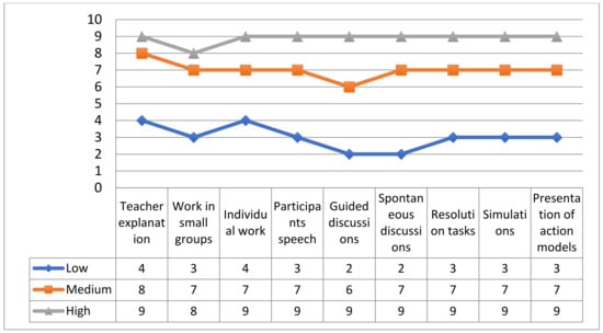 The qualification of the didactic techniques divides the students into three groups. The evaluation of each of the techniques within each group is uniform; however, it stands out that the directed debates and the spontaneous debates are the ones that have a lower importance according to the students’ criteria. Small group work is in the same situation. The techniques with the best valuation are the teacher’s explanation and individual work; regarding the teacher’s work and, more specifically, the explanation given by the teacher to the contents, the students’ preference reinforces the idea of necessary training of teachers for long-term teaching events as pointed out by Andrade et al. [33].