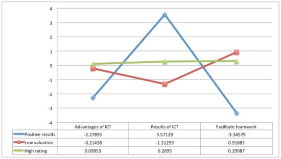 A classification was developed based on the valuation given to the subjects. This classification divided the students into three groups: advantages of ICT, ICT results, and facilitate teamwork. In these groups a marked difference between them can be highlighted. Something that calls attention is that, as a common factor in all groups, the valuation given to the variable that measures ‘a virtual modality is better than a face-to-face one’ is found to be lower. This variable has the lowest valuation, which clearly indicates that students are not convinced that a technology-mediated modality is better than a face-to-face one, and this is corroborated with what the researchers Pérez-López and Cambero Rivero [34] state. In other words, the university must move toward more collaborative and student-centered models.