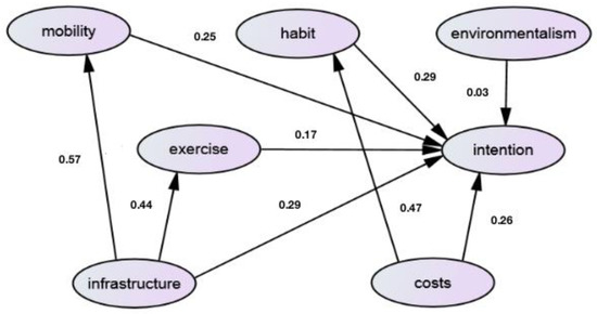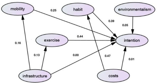 Figure 3 and Figure 4 show diagrams of the path coefficients (unstandardized regression coefficients) of the hypothesized models of China and Estonia, respectively. Table 4 presents the unstandardized regression coefficients and standard errors of the two groups from the analysis result of SEM. In the Chinese model, except for insignificant environmental morality, the other direct impacts on intention have been confirmed by significant regression coefficients. The indirect impacts have also been confirmed: the effects of the availability of the cycling infrastructure on intention are mediated by fast mobility and the perceived exercise function; the effect of beneficial cost on intention is mediated by habit strength. Thus, the availability of infrastructure not only has a direct effect on intention, it could also indirectly influence intention through setting up impacts on the fast mobility and exercise function. Besides, beneficial cost, which has a direct effect on intention, can also indirectly affect intention through habit strength.