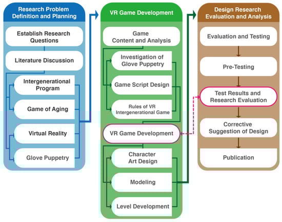 According to the literature, a proper intergenerational program can successfully enhance intergenerational communication. The game developed by this study focuses on the communication and interaction of different generations. Thus, the game’s interaction becomes an extremely important design core. From the scenes of the game, the elderly can recall their childhood, and the younger generation can approach the culture and history of Taiwan through its content. The research design (Figure 2) and game characteristics are shown below.