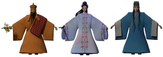 3D character design of virtual puppets (from left to right, Fa Hai, White Snake, and Hsu Hsien).