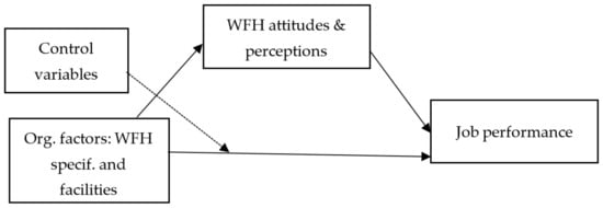 The consequences of remote working on work effort, work-life balance, and wellbeing have been explored in other works [22]. This switching from fixed workplaces to a home office is not related to circumstantial factors but to dynamic organizational factors, such as organizational commitment, job satisfaction, and job-related wellbeing. However, a previous study [39] revealed that the productivity of WFH could also be a source of pitfalls in the COVID-19 context. Several scholars investigated the impact of WFH on job performance [8,31] whereas others examined the effect of WFH on employees’ attitudes and perceptions [35,40]. Based on the preceding discussion, the following hypotheses are suggested: