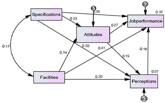 Table 7 reports the impact of control variables on the connection between job performance and attitudes and perceptions (intermediate variables). All control variables had no significant effect regarding the facilities. Gender as a control variable has a negative significant effect on specifications, perceptions, and attitudes, with a double negative effect for females than males. The second control variable—educational level—has no significant effect on job performance via specifications, perceptions, and attitudes.
