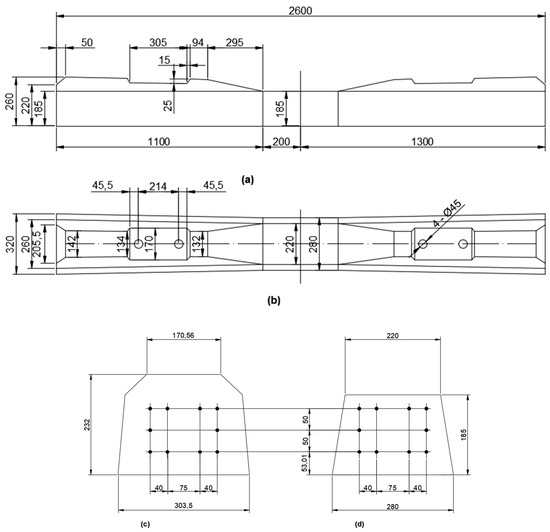 Figure 2. Geometric details of the Chinese Type III prestressed concrete sleeper: (a) Front elevation; (b) Plan; (c) Rail seat section; (d) Midspan section.