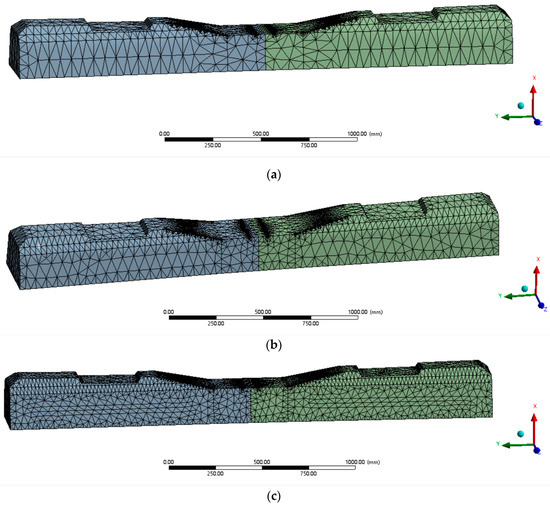 Figure 3. Finite element prestressed concrete sleeper model. (a) Mesh size 40 mm; (b) Mesh size 30 mm; (c) Mesh size 20 mm.