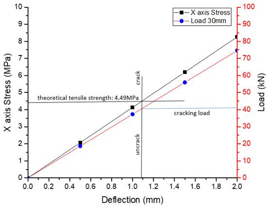 In crack analysis, initial cracking point needs to be confirmed. Therefore, the failure mode of the FE sleeper model is validated. As we know, concrete starts cracking when the load exceeds maximum tensile strength. The theoretical tensile strength according to Eurocode 2 is calculated in order to determine initial cracking point. The theoretical tensile strength is input in numerical load–deflection curve to find initial cracking deflection. In the theoretical calculation, initial crack occurs at 4.49 MPa with 1.09 mm deflection shown in Figure 5. Therefore, the initial cracking point of FE sleeper model converted into force is 42.16 kN. In comparison with experimental initial cracking force (45 kN), the deviation is only 6.30%.