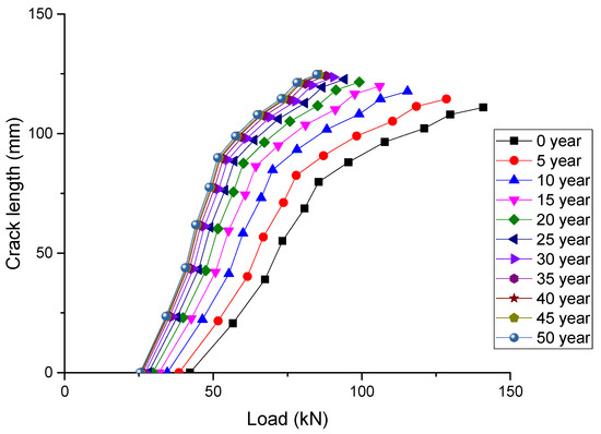 • Ultimate crack length at midspan increases with time. The ultimate crack in 50 years increases by 12.45% in comparison with new sleepers. However, long-term crack propagation shows that lower applied load causes higher crack length due to degradation. The failure load also decreases with time.