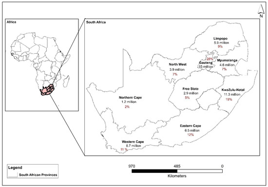 The International Social Survey Program (ISSP) “Environmental III” data collected from 2010 to 2012 was used for this study. The ISSP is an international research group from 53 nations (ISSP http://www.issp.orgi, accessed on 1 February 2016) that undertake sample surveys of different topics across member countries. South Africa has been a member of this research group since the year 2003. South Africa has a human population of nearly 60 million inhabitants that is distributed in 9 provinces, as shown in Figure 1 [36]. The country lies at latitude 22° S to 35° S and longitude 17° E to 33° E, in the southernmost part of the African continent, and has a land area of 1,220,813 km2. South Africa shares international borders with Namibia on the Atlantic coast, Mozambique on the Indian Ocean, and Botswana, Zimbabwe, and Swaziland. The provinces are as follows: Eastern Cape, Free State, Gauteng, KwaZulu-Natal, Limpopo, Mpumalanga, Northern Cape, North West and Western Cape (Figure 1).