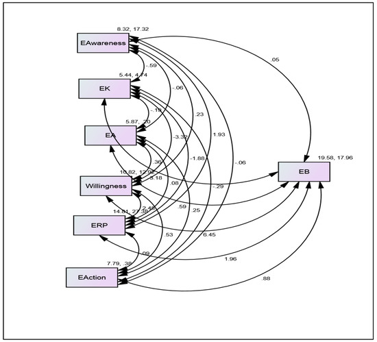 Bivariate correlations to show pro-environmental behavior. Note: Environmental Knowledge—EK; Willingness to sacrifice—WS; Environmental Attitudes—EA; Environmental Risk Perception—ERP; Environmental Behaviour—EB; Environmental Activism—EActivism.