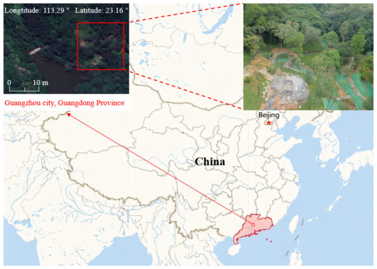 The test region is located at the south foot of Baiyun Mountain in the central city of Baiyun District, Guangzhou City, Guangdong Province, China (Figure 1). It covers approximately 1500 m2. It is located in the subtropical marine monsoon climate zone, with an annual average temperature of 23 °C. The highest temperature is 38 °C, and the lowest temperature is 0 °C [28,29]. Typhoons and rainstorms are frequent in the severely hot summers, with an average annual rainfall of 1899.80 mm. Under high-intensity continuous rainfall, the garden is prone to soil loss, resulting in low vegetation coverage.