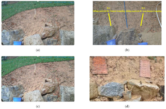 Field test of rainfall erosion in Zones I, II, III, IV, and V. (a) Natural soil; (b) added material for 4 h + manual trampling or non-manual trampling; (c) added materials for 12 h; (d) added materials for 24 h; (e) added materials for 48 h.