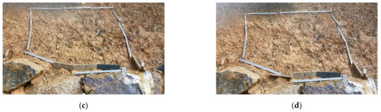 Field test of slope erosion process in condition III. (a) Continuous erosion for 0 min; (b) continuous erosion for 3 min; (c) continuous erosion for 5 min; (d) continuous erosion for 10 min.