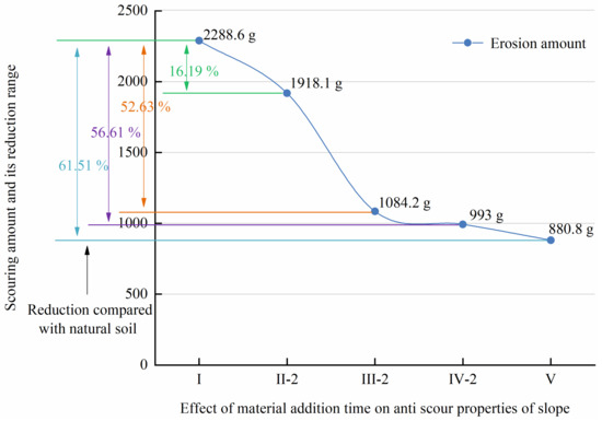 Under the artificial rainfall simulation, the total amount of slope erosion and the reduction range of corrosion under various working conditions were obtained (Figure 5).