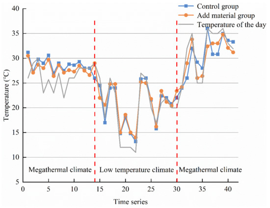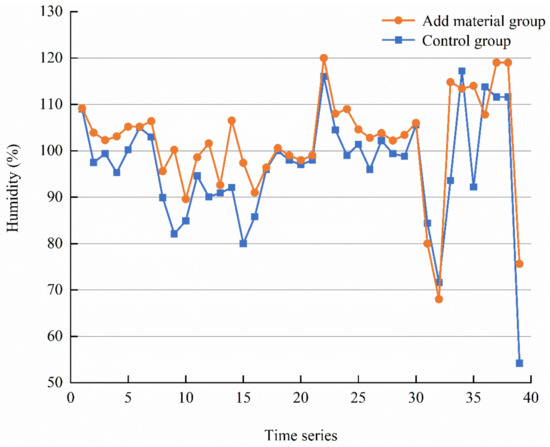 - The on-site soil environment monitoring mainly included the use of a thermometer, hydrometer, compaction instrument, gas analyzer, conductance instrument, and other instruments to continuously monitor the soil temperature, humidity conditions, compactness, oxygen content, carbon dioxide content, and conductivity (Table 4). These indexes are important factors that affect soil, and plant growth is directly related to them. In the process of plant growth, these soil indicators need to be collected and monitored regularly and effectively. The monitoring time in this study lasted from 12 October 2020 to 14 October 2021. During the monitoring period, 10 points were selected from the material group and the control group at the test site every week for data collection. The temperature, humidity conditions, compactness, oxygen content, carbon dioxide content, and conductivity were measured respectively. Totals of 820 temperature data, 780 humidity conditions data, 700 compactness data, 740 oxygen and carbon dioxide content data, and 600 conductivity data were recorded. Then, using the average values of 10 data of each week’s addition group and control group as data points, we drew the curve. Based on this, the changes in the average monitoring indexes with time between the addition group and the control group were compared. Using statistical analysis, it was determined that the averaging method was effective.