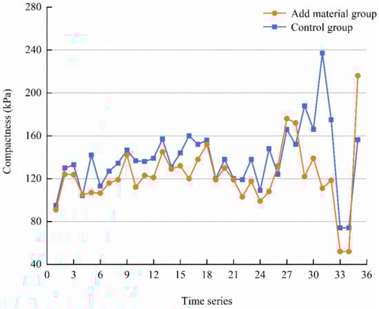 The changes in soil compactness at the site during the monitoring period are recorded in Figure 8. Among them, the compactness decreased sharply for the 29th, 30th, and 31st times in the additive group, which is chiefly attributed to the randomness of the monitoring methods. Predominantly, the compactness of soil with high-performance ester materials is, on average, 15.00% lower than it is without them.