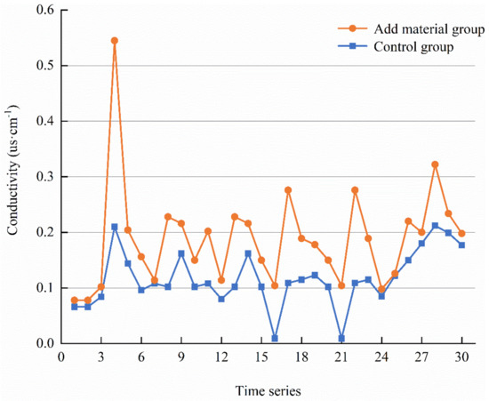 The conductivity in ground pores can reflect soil nutrient status to a certain extent. In a certain range, the higher the soil conductivity, the better the ground nutrient conditions. Figure 10 shows the changes in soil conductivity at the site during the monitoring period. Among them, there were sudden changes in the data at the 3rd, 17th, and 22nd conductivity monitoring time points. It may be that the monitoring area was watered on the days of data monitoring, resulting in sharp increases in conductivity. A decrease in the ground internal density remains the fundamental state to promote the extension of plant roots, which is the necessary condition for soil conservation.