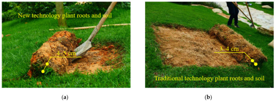 Monitoring and comparison of grassland thickness on garden slope. (a) Grasses with added materials; (b) grasses without material.