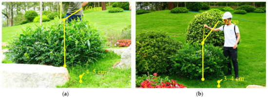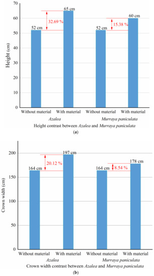 Comparison of shrub height and crown width on the on-site slope. (a) Height contrast between Azalea and Murraya paniculata. (b) Crown width contrast between Azalea and Murraya paniculata.