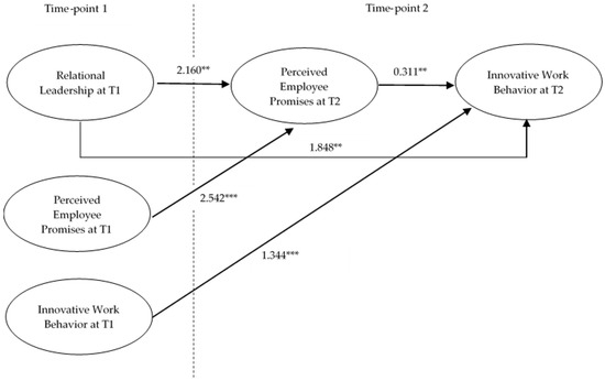 Additionally, Sobel’s test was applied to confirm the mediation effect of the perception of employee promises [86,87]. The result indicated a significant indirect effect of relational leadership on innovative work behavior mediated by the perception of employee promises (Sobel test statistic = 2.58 > 1.96). Hence, Hypothesis 1 was supported, and Hypothesis 2 was partially supported.