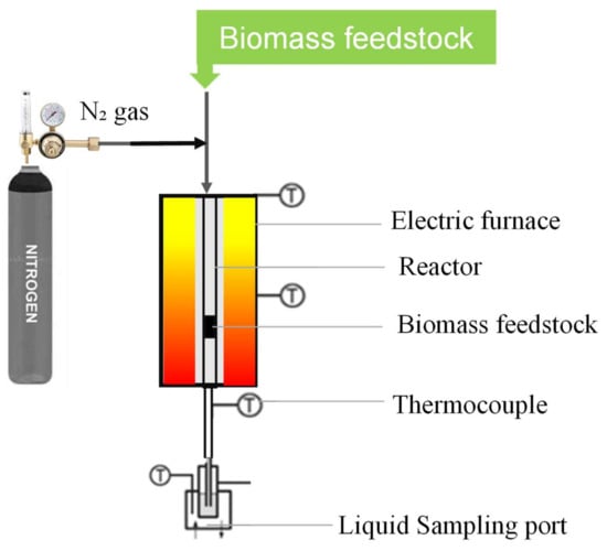 Biomass-derived bioenergy has received much interest as a renewable energy option to replace fossil fuels, owing to its potential to provide sustainable energy, abundance, carbon-neutrality, low cost, and inherently environmental friendliness [1,2]. Several methods are developed to produce energy from biomass, including biological and thermochemical processes. Biological conversion is considered a less energy-intensive process than the thermochemical route, but it has shortcomings due to long processing times and rigorous requirements of temperature and pH [3]. Thermochemical processes of gasification, torrefaction, and pyrolysis are considered favorable due to them being more cost-effective and efficient [4,5,6]. Pyrolysis is a thermochemical process that has received much interest in recent years as a cost-effective and energy-efficient process for biomass conversion to biofuels and valuable chemicals [7]. Principally, pyrolysis is conducted by biomass conversion at a temperature between 300 and 600 °C in the absence of oxygen, generating three main products, i.e., bio-oil, biochar, and syngas [8]. Pyrolysis has recently been recognized as a viable approach for managing some biomass sources for the simultaneous production of high-calorific-value liquid and gas products, as well as a carbon-rich solid that can be utilized as activated carbon, soil ameliorant, etc. [9].