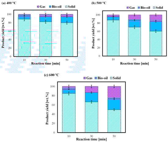 Product yield distribution of U. lactuca at the different reaction temperatures of (a) 400 °C, (b) 500 °C, and (c) 600 °C.