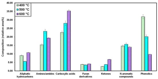 Compounds obtained from the pyrolysis of U. lactuca as shown in Table 1 can be classified into several groups, namely aliphatic hydrocarbon, amines/amides, carboxylic acids, furan derivatives, ketones, N-aromatic compounds, and phenolic compounds (Figure 3). Carboxylic acid was the most predominant compound observed from the pyrolysis of U. lactuca, representing 22.63–35.28% of the total relative area. The formation of short-chain carboxylic acids has been linked to the thermal decomposition of lipids. The result of this study is in line with the previous finding of Iaccarino et al. [10], who observed that carboxylic acids were predominantly found in bio-oil from the pyrolysis of Salicornia bigelovii.