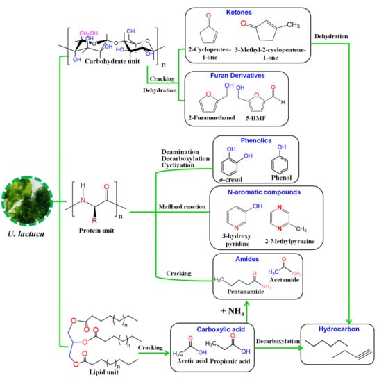 A plausible reaciton pathway of U. lactuca decomposition during pyrolysis.
