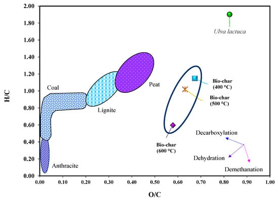 The Van Krevelen diagram was also presented to investigate the evolution of O/C and H/C atomic ratios during the pyrolysis of U. lactuca (Figure 5). The O/C atomic ratio remarkably decreased from 0.82 for U. lactuca feedstock to 0.67, 063, and 0.58 for biochar at 400, 500, and 600 °C, respectively. A similar trend with the O/C atomic ratio, the H/C atomic ratio also significantly decreased from 1.90 for U. lactuca feedstock to 1.15, 1.02, and 0.60 for biochar at 400, 500, and 600 °C, respectively. The reduction of O/C and H/C atomic ratios of biochar obtained from the pyrolysis of U. lactuca could be attributed to the dehydration and decarboxylation reactions that occurred throughout the pyrolysis.