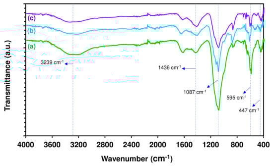 The biochar obtained from the pyrolysis of U. lactuca was also characterized by FTIR (Figure 6). Meanwhile, the typical band assignment from the FTIR spectra of biochar obtained from the pyrolysis of U. lactuca at different temperatures is summarized in Table S2. The broadband at 3239 cm−1 indicated O–H stretching vibration in the biochar at a pyrolysis temperature of 400 °C. However, this peak disappeared when the pyrolysis temperature was increased to 500 and 600 °C, confirming that the dehydration reaction was enhanced with high pyrolysis temperature. The absorption band at 1436 cm−1 was assigned in the spectra of biochar, indicating the aliphatic C–H bending. Meanwhile, strong peaks at 1087 cm−1 were observed to stretch vibrations from the C–O group. Moreover, a few peaks at 873 cm−1 were observed, indicating the aromatic C–H out-of-plan bending, as Gautam et al. [41] reported. This peak indicated that the biochar contains aromatic compounds. Furthermore, the peaks around 595–873 cm−1 have been attributed to the existence of polycyclic aromatic hydrocarbons (PAHs), which could be produced throughout the pyrolysis of biomass [10].