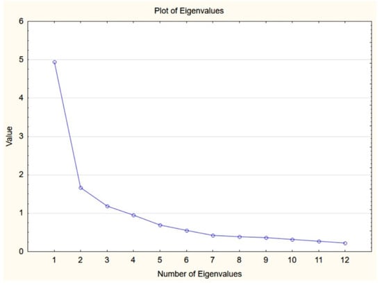 It is indicated that the concept of an eigenvalue is important in determining the number of components retained in principal component analysis [33]. This is why, in the next step, the eigenvalues were estimated based on the Kaiser criterion related to correlation matrix analysis (Table 3). Kaiser criterion considers only the components whose eigenvalue exceeds or is close to 1.