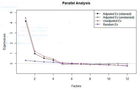 In the next step, Horn’s parallel analysis was used (Figure 3) based on Kanyongo’s [33] suggestions.