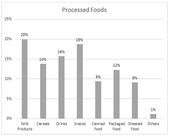 Regarding the TLNL, 97% of the people surveyed knew it existed. Regarding the type of labels that the processed products use, 48% stated that they could better interpret the TLNL, while 11% preferred the label that contains the nutritional information; 38% used both labels, and a small percentage used neither (3%). The majority (65%) of the people surveyed had confidence in the TLNL, although only 58% reported using it. Of these, 54% stated that they use it to have information about the foods they consume, and 74% stopped consuming a food after reading the sugar, salt, and/or fat content. Regarding the understanding of TLNL, 40% of the respondents had a high level of understanding, 51% a medium level, 7% low, and 2% did not understand. In addition, 96% indicated that the TLNL helps them identify healthy foods from unhealthy ones. Most (88%) respondents knew the meaning of “processed foods” and tended to use the TLNL to understand dairy products (20%), snacks (19%), soft drinks (16%), and cereals (14%) (Figure 1). Disease of any type was present in 20% of respondents. Additionally, 71% of those surveyed reported that the COVID-19 pandemic had affected their eating habits. Approximately 86% understood what marketing is, and 71% understood RM. Finally, it is important to mention that 82% of the people surveyed had been positively influenced due to the COVID-19 pandemic, consuming less junk food (40%), having a balanced diet (34%), and drinking enough water (22%), among other new habits (5%) (Figure 2).