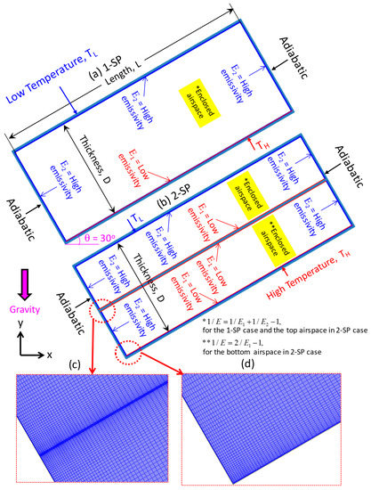 For the 30° airspace subjected to upward heat flow, Figure 1 shows that the boundary conditions used to solve the energy equation: (a) temperature conditions on top surface with low temperature of TL and the bottom surface with high temperature of TH, and (b) adiabatic conditions on the right surface and the left surface. In order to calculate the airspace R-values, both the right and left surfaces must be treated as thermally insulated/adiabatic [21,22,23,24,25,26]. The boundary conditions used to solve the transport equations for the air filling the space are no-slip conditions on all surfaces for 1-SP case (Figure 1a) and 2-SP case (Figure 1b). According to Figure 1, the surface-to-surface radiation equation was subjected to various emittance values (E1 and E2).