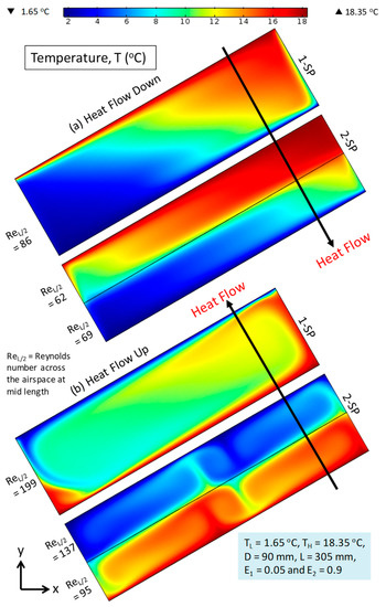 - As previously shown for airspace of the same L, D, E, Tavg, and ΔT [22,31], a larger NL value improved the thermal conductance, leading to a smaller R-value. For the 30° airspace of 90 mm thick, the 1-SP case contained one convective cell with two small vortices for the scenario of downward heat flow (Figure 3a) and one convective cell with four small vortices for the case of upward heat flow (Figure 3b). Furthermore, for the same thickness (D = 90 mm), each space in the 2-SP case had one convective cell for downward heat flow (Figure 3a) and three convective cells of varying sizes for upward heat flow (Figure 3b).